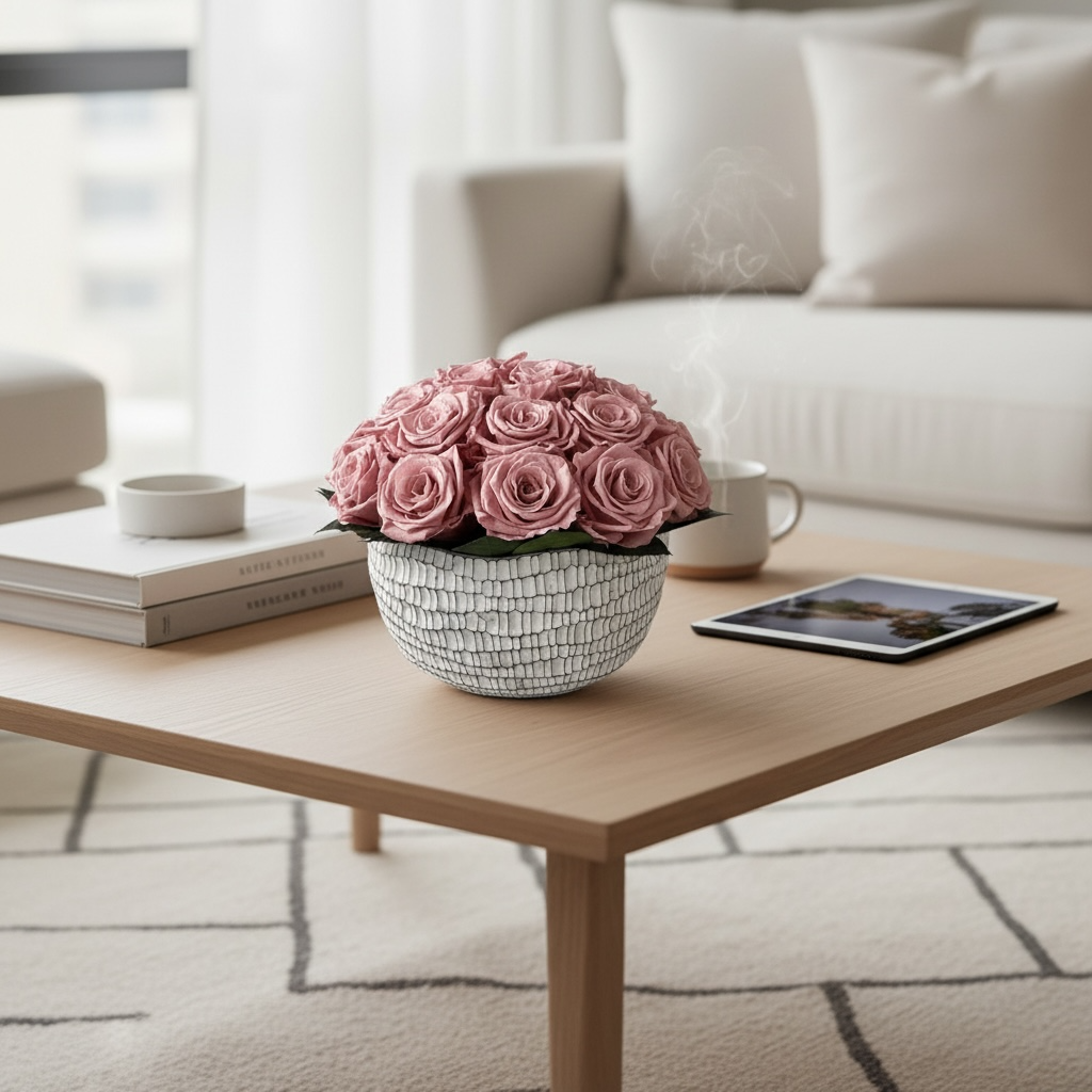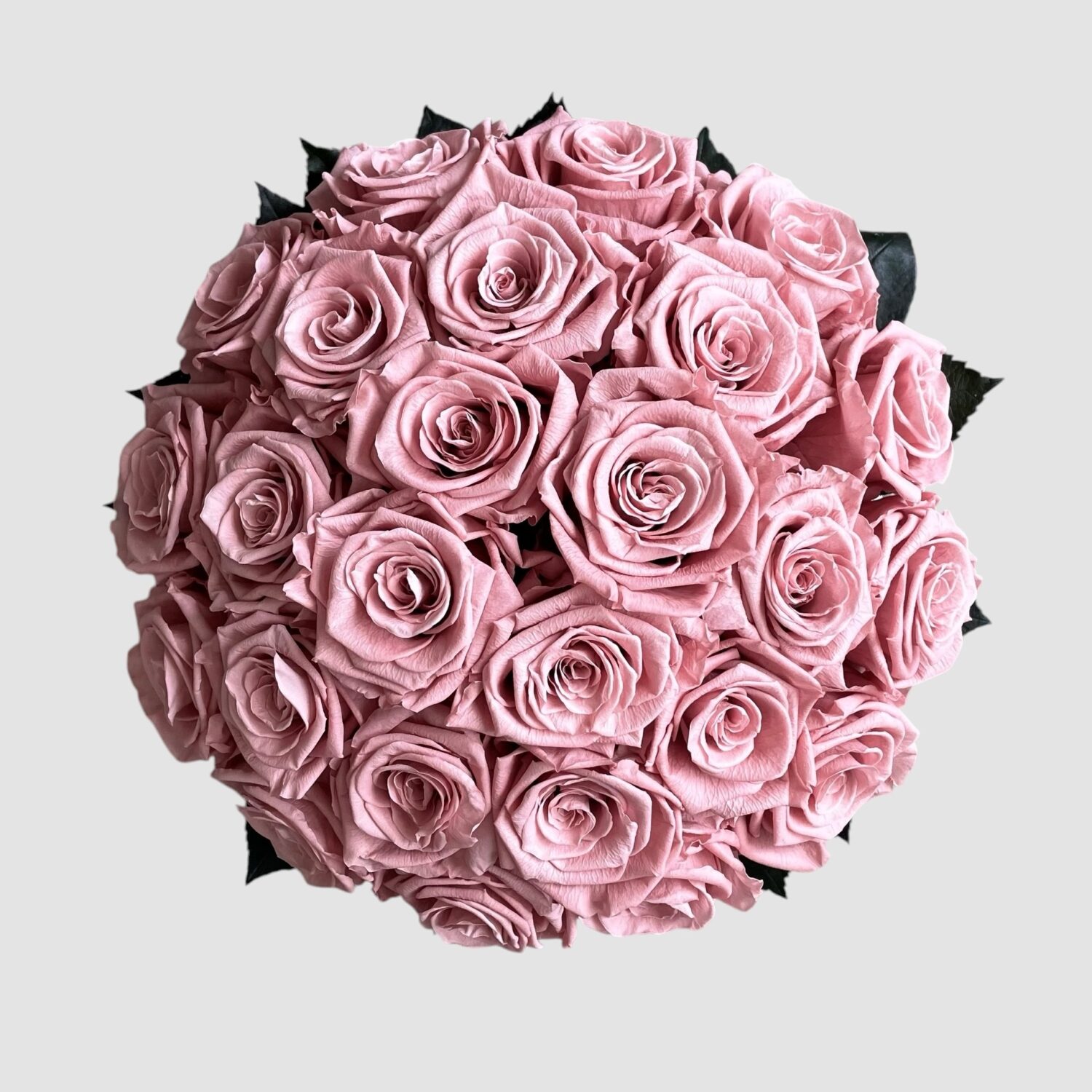 Ein langlebiges Rosenarrangement, das 2-3 Jahre bei richtiger Pflege hält – ideal als Geschenk oder stilvolles Wohnaccessoire.